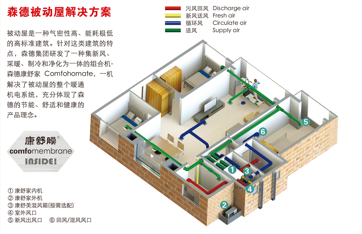 被动式节能建筑室内居住环境系统的核心, 一机多能:新风 /净化;制冷 /制热;除湿。